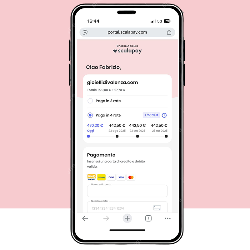 L'innovativo metodo di pagamento con cui puoi acquistare i nostri splendidi gioielli dividendo il pagamento in 3 o 4 comode rate, senza interessi.